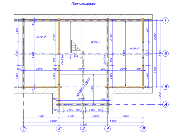 Мансарда в базовой комплектации представляет собой одно общее помещение без перегородок. Снаружи и изнутри, включая потолок, обшита вагонкой класса "В". Утепление не производится. Пол мансарды собирается из половой строганной шпунтованной доски 30-40 мм. Высота потолка 2,4 м.