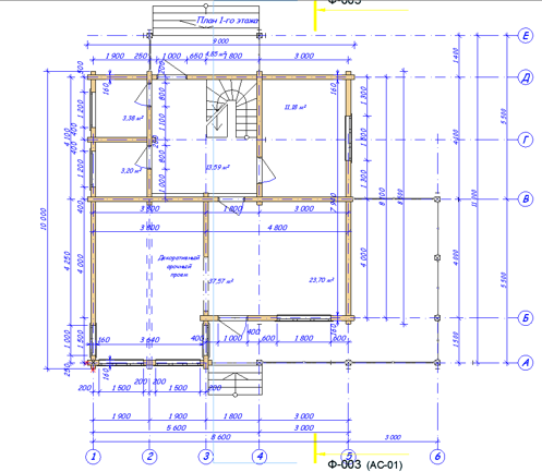Внутри дома устанавливается лестница, основные элементы которой (ступени, косоуры, тетива) изготавливаются из деревянного мебельного щита. Полезная ширина ступеней лестницы - 830 мм. Сборка лестницы производится на саморезы с применением металлических уголков для крепления забежных ступеней и других элементов конструкции.